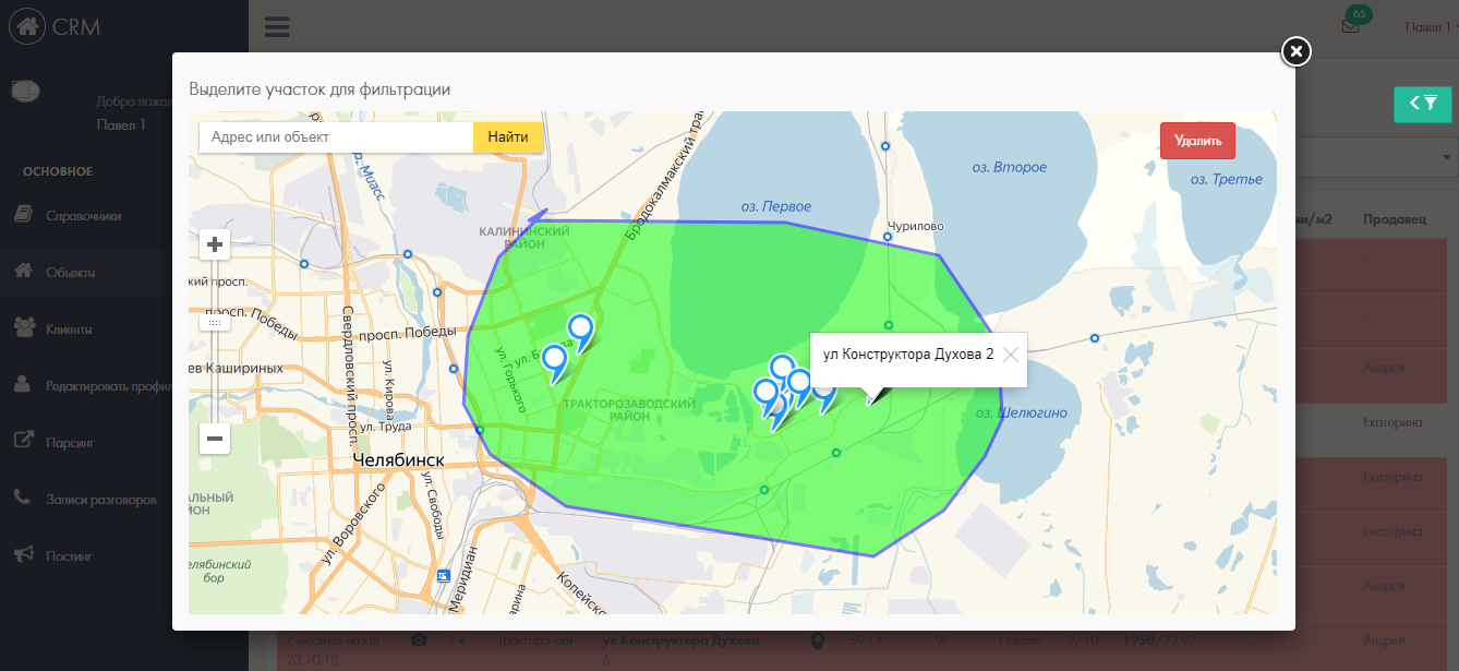 Затем был разработан "умный" фильтр, позволяющие подбирать недвижимость по характеристикам клиента, на основе уже накопленной базы знаний. Так же был реализован интерактивный фильтр по карте, где можно было обвести нужную территорию и увидеть продаваемые там объекты.